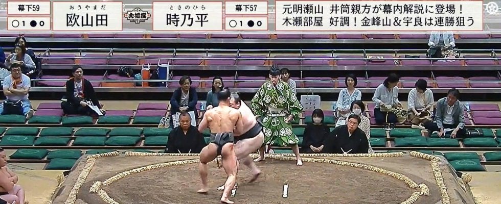幕下五十九枚目・欧山田(鳴戸)が幕下五十七枚目・時乃平(時津風)を送り出しで下して2勝目の勝ち星を挙げた一番での一コマ。