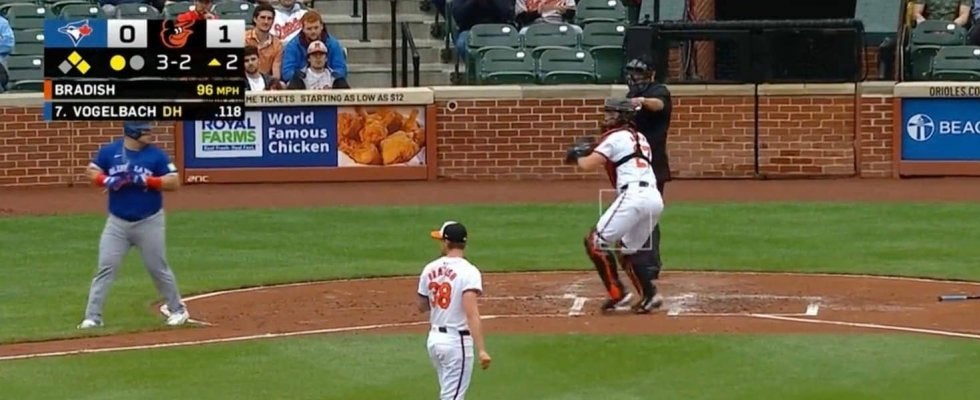0-1、オリオールズ1点のリードで迎えたこの試合の2回表・ブルージェイズの攻撃、1死一、二塁の場面で、打席に立ったのは、巨漢を揺らしながらの全力疾走など、ハッスルプレーが話題となる7番のダニエル・ボーゲルバック。そのボーゲルバックは、しっかりとボールを見極めてカウント3-2とすると、続く6球目、内角膝元へと投じられた変化球を見送ることに。審判のストライクコールがなかったことから、四球だと思ったボーゲルバックは、バットを放り出して一塁へと歩きはじめることとなったが、ボーゲルバックがゆっくり歩きながら手袋をとりはじめると、主審はここでまさかのストライクをコール。そのため、打者走者のボーゲルバックと同様に歩きはじめていた各走者も、慌てて帰塁することとなった。