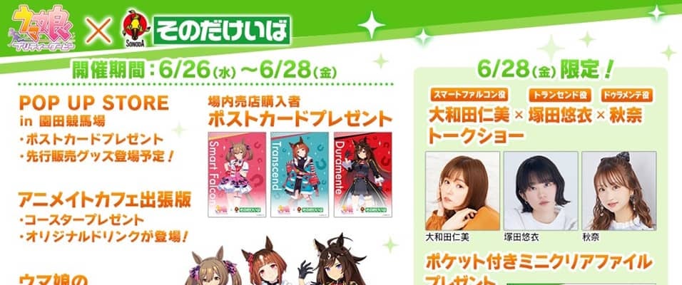 期間中は園田競馬場全体がウマ娘色に染まるだけでなく、来場者プレゼントとしてオリジナルデザインのクリアファイル配布や冠名を拝したレースの実施、スマートファルコン役 大和田仁美さん、トランセンド役 塚田悠衣さん、ドゥラメンテ役 秋奈さんの3人のウマ娘声優によるトークショーなどが予定されている。