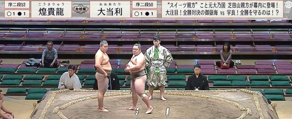 序二段五十二枚目・煌貴龍(立浪)と序二段五十枚目・大当利(式秀)の一番で2度続けて立ち合い不成立となり、19歳の巨体力士が肩をすぼめて猛省する初々しい場面があった。この光景にファンもほっこり。「まだまだ」「ごめんごめん」などの声が寄せられた。