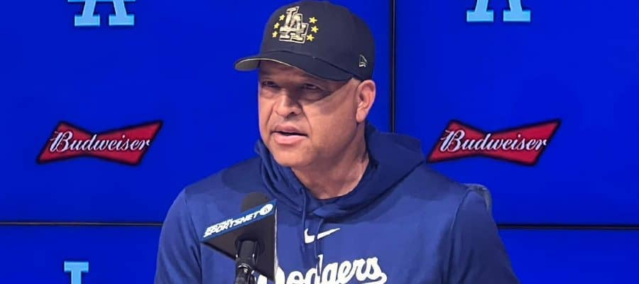 試合前の取材に応じたドジャースのデーブ・ロバーツ監督【写真:川村虎大】