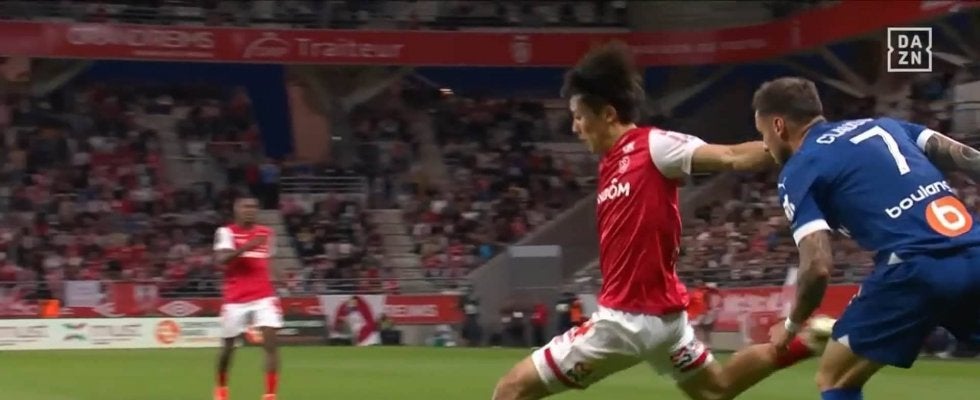 注目のシーンはスタッド・ランスが1-0のリードで迎えた36分だった。攻めるスタッドランスは、敵陣中央やや右寄りの位置で日本代表FW伊東純也がボールを持つと、ドリブルで一気にボックス手前まで駆け上がる。MFテディ・テウマにボールを渡すと、テウマはボックス左に位置する中村へパス。中村は相手の動きを探るようにゆっくりと仕掛けると、左足を踏み込み縦に行くと見せかけてカットイン。一歩分ボールをずらすと、すぐさま右足を振り抜きシュート。ボールはファーサイドのクロスバーを直撃し、相手ゴールを脅かした。