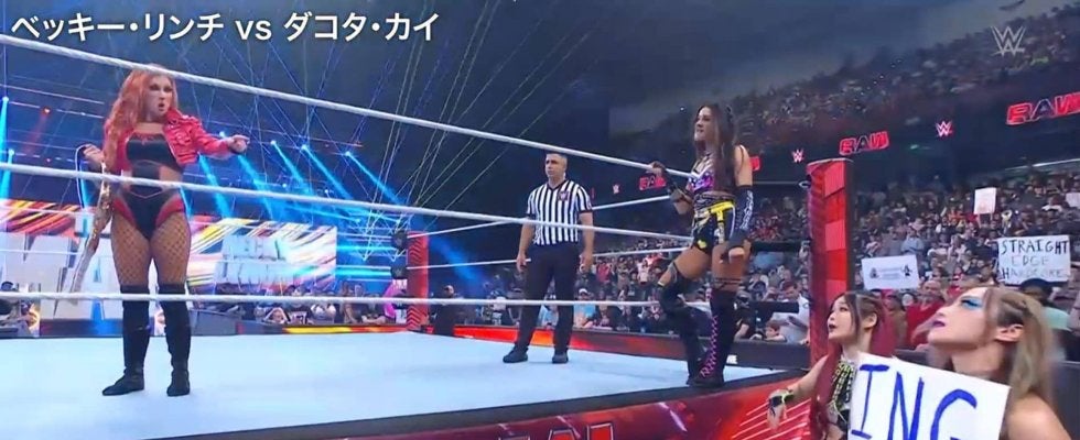 「RAW」にユニットごと移籍を果たしたイヨ・スカイ、カイリ・セインら”ダメージCTRL”の面々がダコタのセコンドとして登場。新たなターゲットなっている新女子王者ベッキー相手にダコタは少し緊張気味の面持ちだが、リング下のカイリは観客から奪ったサインボードを掲げて体をくねらせてダンスでノリノリ、しかもベッキーの入場テーマにも楽しそうに反応する。