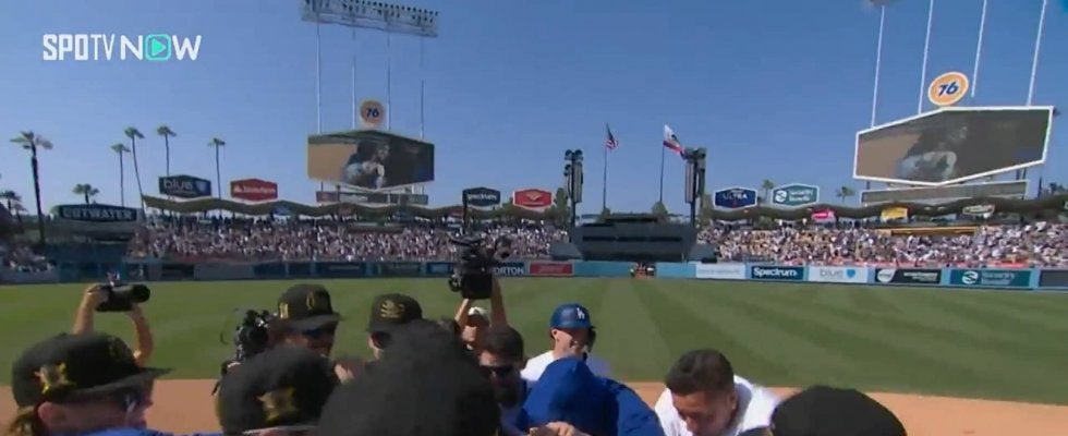 両チームとも決勝点が取れず迎えた延長10回裏タイブレーク。2死一、二塁で打席に立った大谷はディアスが投じた初球のストライクを見逃すと、2球目のスライダーをレフト方向へファウル。カウント0-2と追い込まれた3球目もファウル、4球目を見逃し5球目もファウル。迎えた6球目、内角低めへ投じられたストレートを弾き返すと打球は一、二塁間を割る決勝打。「打っていきましたー、抜けたあああ!」という実況の直後、二塁ランナーのヘイワードがサヨナラのホームを踏みドジャースがサヨナラ勝ち。ヒーローとなった大谷は二塁ベース付近でチームメイトから手荒い祝福を受ける。最後は盟友のベッツ&フリーマンからハイタッチを受けると、バケツを抱えたテオスカー・ヘルナンデスから福福のシャワーを浴びた。