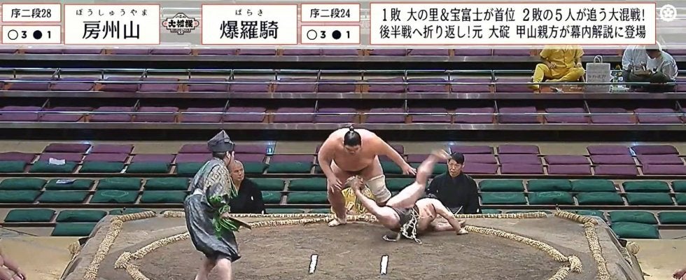 序二段二十八枚目・房州山(境川)が序二段二十四枚目・爆羅騎(式秀)を下して4勝目を挙げた一番で、当初は「はたき込み」とされた決まり手が、のちに発生割合「0.03%」の激レアな決まり手に訂正され、ファンがざわつく一幕があった。
