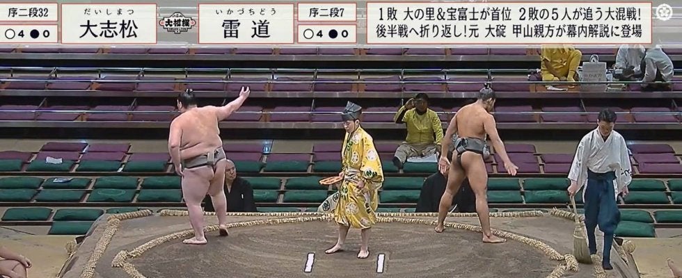 序二段三十二枚目・大志松(阿武松)と序二段七枚目・雷道(雷)の取組直前、大志松が四股を踏んだ際に転んでしまう思わぬハプニングが発生した。目の前で見ていた土俵下の審判はその瞬間驚いたように厳しい表情を浮かべ、何やら声をかけるとファンからも「四股でコケる足腰では…」と困惑の声が上がった。