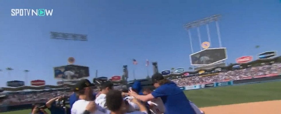 9番バーンズの代打で四球を選び一塁走者となったスミスとハイタッチをした直後、ロハスに祝福の水シャワーをかけられ、さらにドジャースベンチからベッツとフリーマンを筆頭にナインが総出でハイタッチ。さらにバケツを抱えたテオスカー・ヘルナンデスから祝福のシャワーを浴びた。