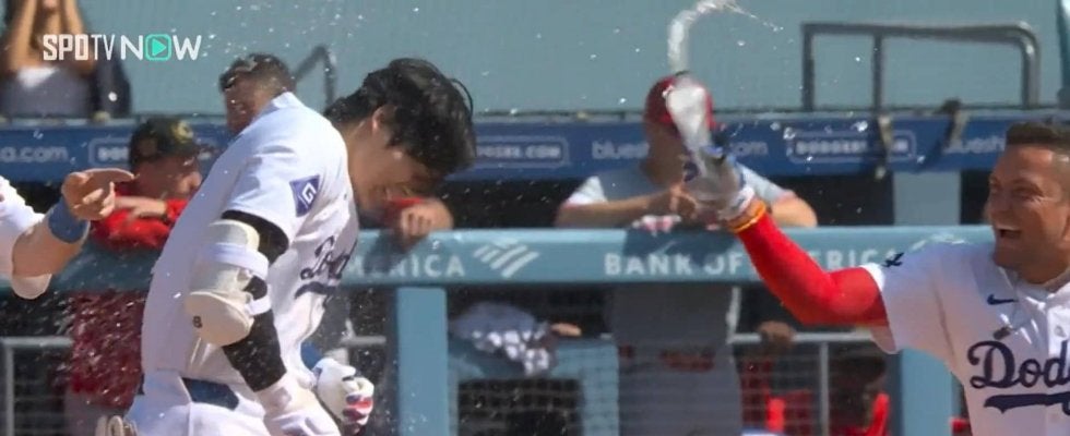 ロハスがペットボトルで大谷に祝福のシャワーを浴びせると、続いてテオスカー・ヘルナンデスがクーラーボックスに入った氷水で、これまた祝福のシャワー。2人のチームメイトがヒーロー大谷を全力で祝ってみせた。