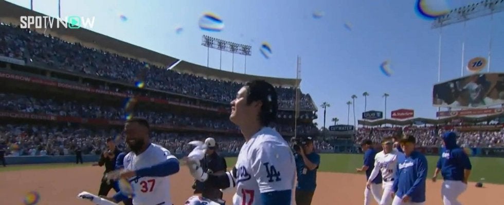 これほどリアルに「水も滴る良い男」になるシーンは、メジャーの中でもそうは見られないだろう。ドジャース大谷翔平投手が「2番・DH」で先発出場、延長10回に自身2度目となるサヨナラ打をライトに放つと、満面の笑みで駆けつけたチームメイトたちから盛大な祝福を受けた。特に目立ったのが、大量の水をかけられた後の大谷の笑顔。直後から各種メディアで取り上げられると、大きな話題となった。
