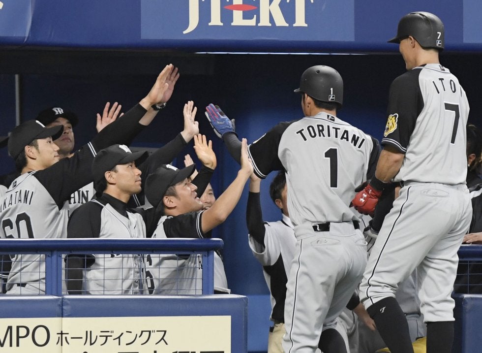 11回、勝ち越し打を放った鳥谷(1)を迎える阪神ナイン=ナゴヤドーム【写真提供:共同通信社】 阪神の鳥谷が20日の中日戦…