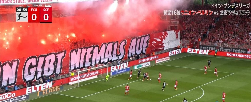 ブンデスリーガ1部残留が懸かった最終節ということもあり、気合いが入ったゴール裏のファンたちは、巨大な横断幕と共にウニオン・ベルリンのチームカラーである赤色の発煙筒を大量に焚いていたのだ。まるで火事にも見えるその光景に、ABEMAで実況を務めた福田浩大氏は「ゴール裏が真っ赤っかに」とこぼすほどだった。