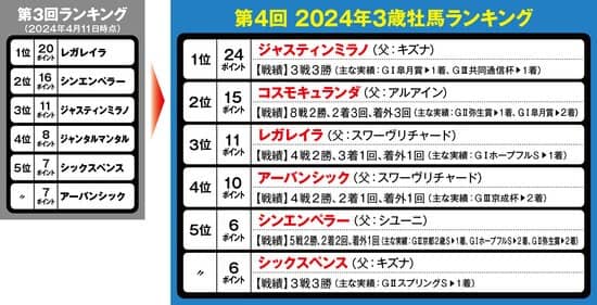 1位は、激戦の皐月賞を制して一冠目を獲得したジャスティンミラノ。前回3位からトップへ浮上。ほぼ満点の24ポイントを得て、ダービーでも本命視されることは間違いない。