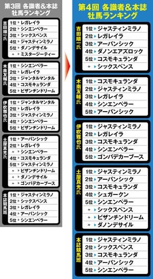 ※『Sportivaオリジナル番付』とは、デイリー馬三郎の吉田順一記者、日刊スポーツの木南友輔記者、JRAのホームページでも重賞データ分析を寄稿する競馬評論家の伊吹雅也氏、フリーライターの土屋真光氏、Sportiva編集部競馬班の5者それぞれが、日本ダービーに挑む3歳牡馬の実力・能力を分析しランクづけ。さらに、そのランキングの1位を5点、2位を4点、3位を3点、4位を2点、5位を1点として、総合ポイントを集計したもの。