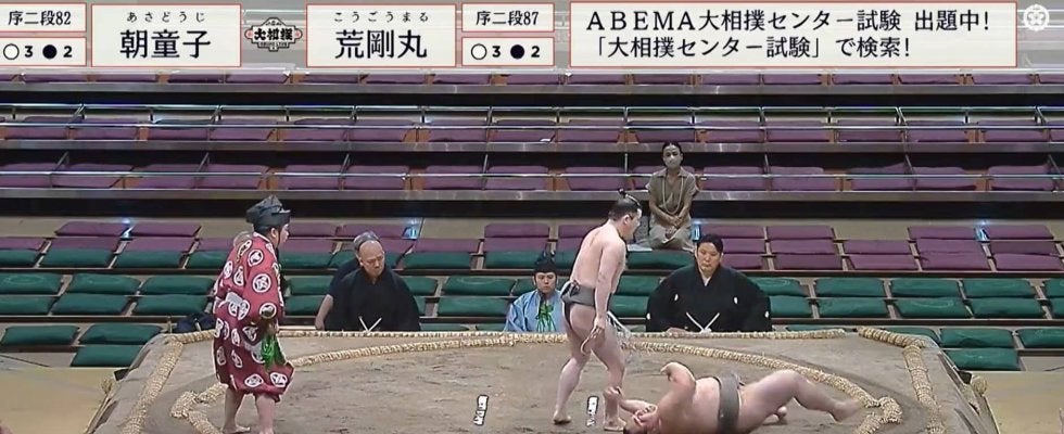 はたき込みを綺麗に決め、体重54.3キロ差対決を見事に制した朝童子に、ABEMAの視聴者も「なんやいまの」「合気道」「動きがいい」と驚きの声を上げていた。(ABEMA/大相撲チャンネル)