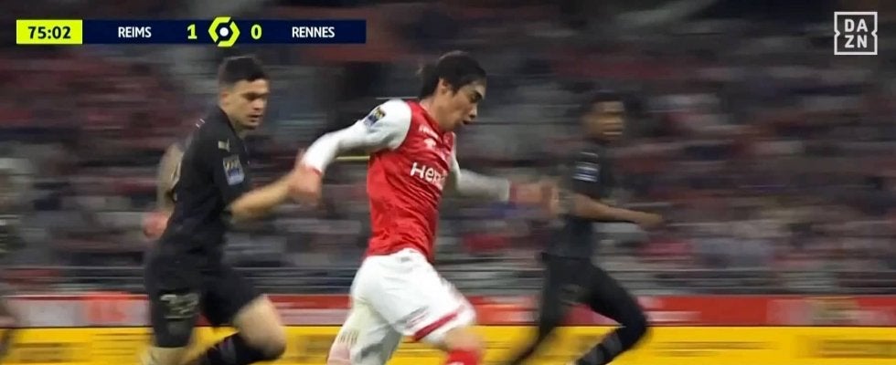 スタッド・ランスが1-0とリードして迎えた75分、ハーフウェーライン手前でボールを受けた伊東は、そのまま爆速ドリブルをスタート。周りに相手がいる中でも自慢のスピードでスペースを作り出して、そのままファイナルサードへと進入した。