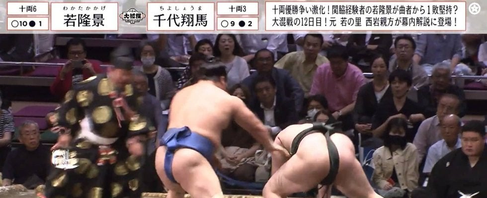 なお十二日目の取組では、十両三枚目・遠藤(追手風)が立ち合い変化の突き落としで十両五枚目・輝(高田川)を下して1敗を死守。新十両の十両十二枚目・阿武剋(阿武松)も十両四枚目・東白龍(玉ノ井)の猛攻に耐えて勝利し星を11に伸ばした。十両優勝争いは引き続き1敗で遠藤、若隆景、阿武剋の3人がトップに並ぶ。(ABEMA/大相撲チャンネル)