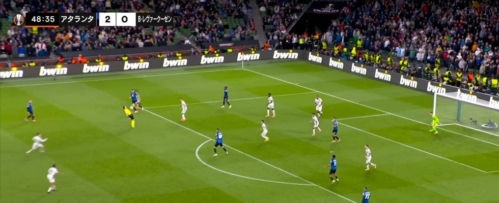 注目のシーンはアタランタが2-0とリードして迎えた49分だった。攻めるアタランタはFWアデモラ・ルックマンがボックス左の位置でドリブルからクロスを上げるも、レヴァークーゼン守備陣がこれをクリア。再びボックス左角付近に落ちたこのクリアボールを拾ったアタランタのDFマッテオ・ルッジェーリが、ダイレクトでパスを送った瞬間だった。