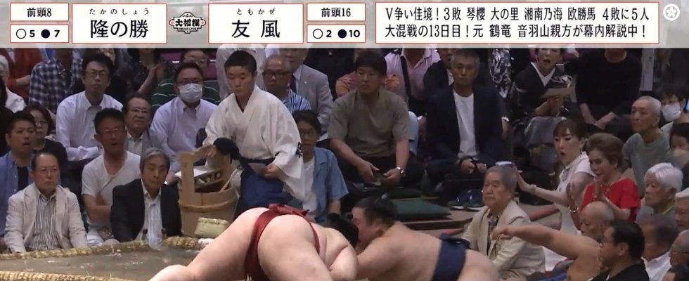 連日のように著名人の相撲観戦が話題を呼んでいる大相撲五月場所。十三日目はタレントのデヴィ夫人が華やかな赤ドレスを着用して西のタマリ席にいたが、前頭八枚目・隆の勝(常盤山)と前頭十六枚目・友風(二所ノ関)の一番で“ハプニング”が起きた。