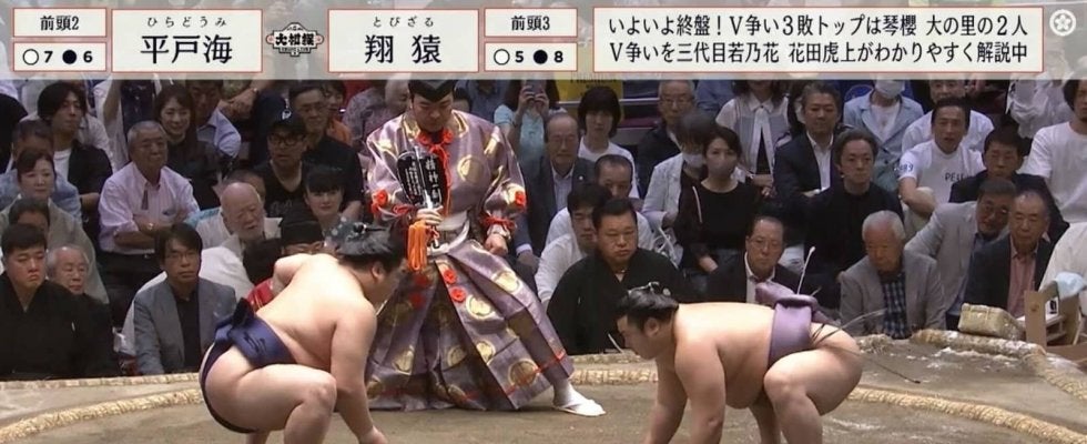 前頭二枚目・平戸海(境川)と前頭三枚目・翔猿(追手風)の一番では、敗れた翔猿が土俵下に勢いよく落下する一幕があった。この光景に館内は一時騒然とし、「すっごい飛んだ」「ひらどんロケット」などの声がコメント欄に並んだ。