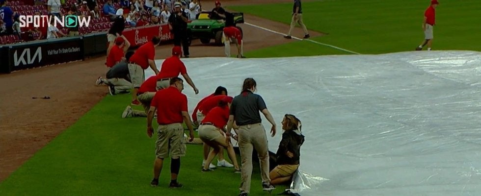 熱狂的なレッズファンが集まることで有名なグレートアメリカン・ボールパークで行われたレッズ対ドジャースは、5回終了時に雨天中断となった。その準備中にスタッフがシートに巻き込まれるアクシデントが発生。まさかの事態に球場が騒然となる場面が見られた。