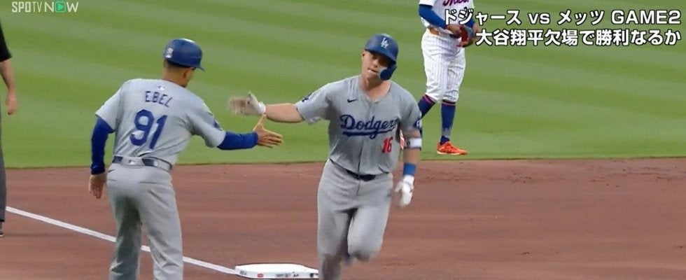 第1試合終了からわずか40分程度のインターバルを挟んで始まった第2試合で大谷は、試合前からロバーツ監督が名言していた通り休養でベンチスタート。その代わりに普段は「4番・キャッチャー」で先発することが多いスミスが「2番・DH」で先発した。そのスミスは1回、第1打席でメッツ先発キンタナの4球目のストレートを振り抜くと、少し詰まったようにも見えた打球はそのままレフトスタンドへ。前の試合勝利の勢いそのままに先制弾となる今季7号ソロを放った。