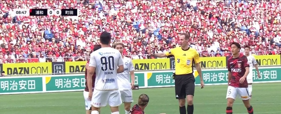 注目のシーンはゴールレスで迎えた8分だった。右サイドでボールをもった浦和のDF石原広教が自陣中央へとドリブルし倒される。このFKを浦和DFアレクサンダー・ショルツが素早くリスタートを開始しようと、後方から助走に入ると突然転倒。ショルツと石原は「何するんだ!」と言わんばかりに町田FWオ・セフンに対して両手を広げて訴えた。しかし、このシーンをリプレイでよく見ると、オ・セフンは背後からくるショルツの存在に気が付いておらず、軽く体が当たっただけだった。