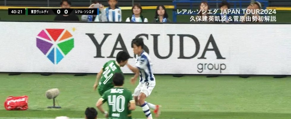 遊び心のあるプレーで大観衆を沸かせた。レアル・ソシエダのFW久保建英が、相手の股下を抜く見事なドリブルを披露し、解説を務めた日本代表で同僚の菅原由勢が「見たまんま、うまい!」とコメント。これにはABEMA視聴者も「久保遊んでて草」「解説しないんかいw」と盛り上がりを見せた。