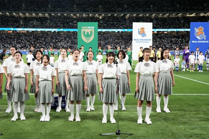 サッカーの場合、両チームのゴール裏に陣取ったサポーターがタイコなどの鳴り物を入れて熱狂的な応援をすることが普通だが、今回、バックスタンドに陣取ったのは、洗足学園高校、大学のブラスバンド部だった。高校野球では定番中の定番ともいえるZARDの『負けないで』や最近、大流行のCreepy Nutsの『Bling-Bang-Bang-Born』などを演奏すると、まるで夏の甲子園のような雰囲気に。また、試合前の国歌斉唱は、洗足学園中学校の合唱部が担当した。