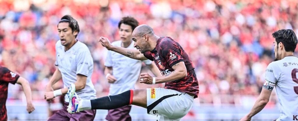 浦和レッズはヴィッセル神戸と対戦した。写真はチアゴ・サンタナのシュート場面 撮影:中地拓也