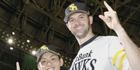 西武に勝利し、お立ち台でポーズをとるソフトバンクの今宮(左)とバンデンハーク=ヤフオクドーム【写真提供:共同通信社】 首…