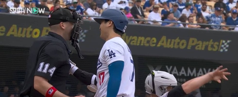 大谷翔平のファウルが2度も直撃した球審、一躍ファンから注目の的 1発目は右手、2発目は右足と“1打席2発”で大谷も笑顔で謝罪の一コマ