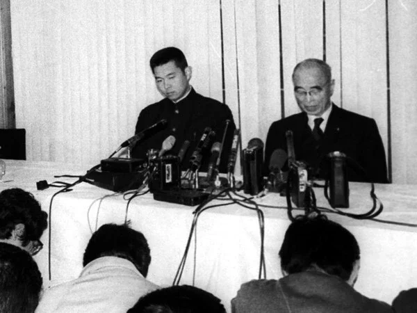 1977年12月3日、記者会見でクラウンへの入団拒否を表明する江川卓(写真左)