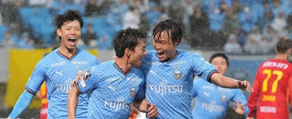 名古屋との一戦、先制点を決めた川崎Fの家長昭博(前列左)が大南拓磨と喜ぶ。「さすが川崎」という良いプレーもあるが、現在14位と苦戦中だ。撮影/原壮史(Sony α1使用)