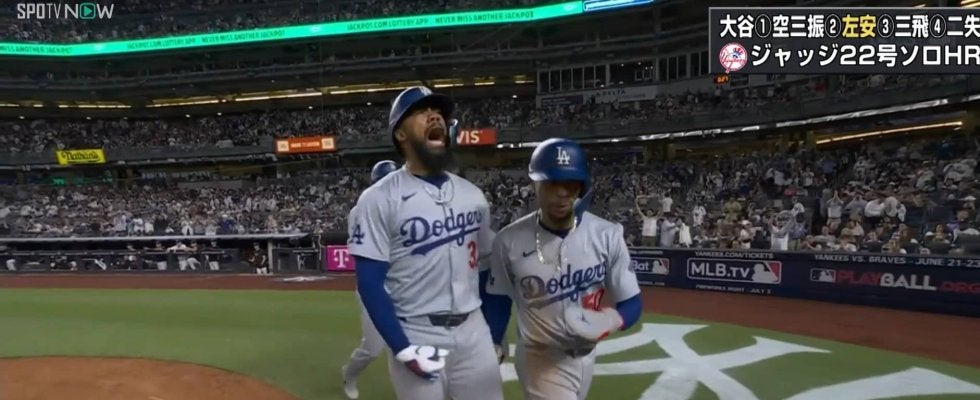 大谷が本塁打を放った際には、ひまわりの種で真っ先に祝福するなど、チームのムードメーカであるヘルナンデス。そんなヘルナンデスの大爆発に仲間が見せたそれぞれのリアクションが、ヤ軍からの連勝とチームの雰囲気の良さ“チーム一丸”を印象づけるシーンとなったが、そんな様子にファンからは「テオスカーやばw」「めっちゃ叫ぶw」「ロバート監督やっぱりアツいな」「あのベッツが爆笑w」「大谷さんもニッコリ」などの反響が。