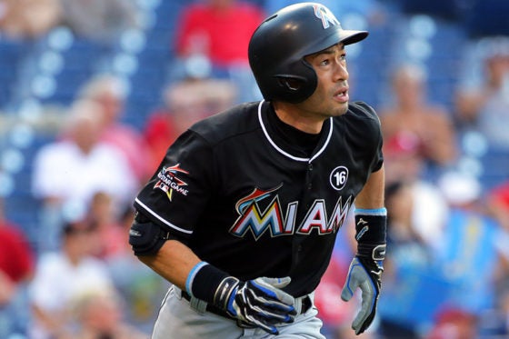 右中間スタンド最深部に代打決勝弾を放ったマーリンズ・イチロー【写真:Getty Images】