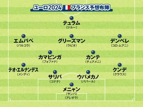 キャプテンのキリアン・エムバペ(パリ・サンジェルマン→レアル・マドリード)をはじめ、マルクス・テュラム(インテル)、ウスマン・デンベレ(パリ・サンジェルマン)、アントワーヌ・グリーズマン(アトレティコ・マドリード)と前線はもちろん、他の国が羨むほど中盤から最終ラインまで穴がないほどタレントで埋めつくされる布陣は、今大会屈指の戦力だ。