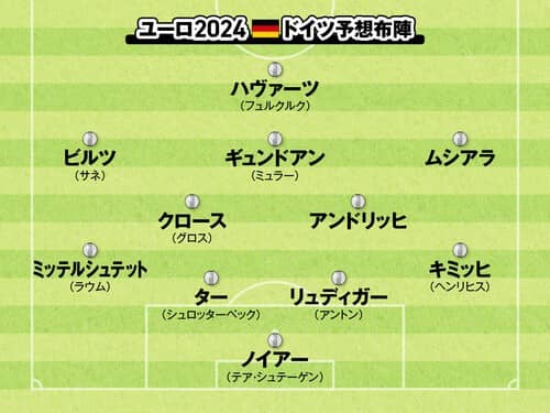 この3月の試合で話題となったのは、トニ・クロース(レアル・マドリード→今大会で現役引退)の代表復帰である。ボランチにクロースが帰ってきたことで、ボールの流れはスムーズになり、フロリアン・ビルツ(レバークーゼン)やジャマル・ムシアラ(バイエルン)といった今大会屈指のタレントがより生きるようになった。