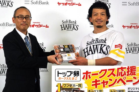 トップ卵がホークスに「応援卵」を贈呈、チームの“元気印”松田が受け取る | 野球