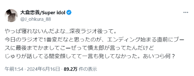 SUPER EIGHTの大倉忠義が16日に自身のXを更新。深夜ラジオでの一幕を投稿し話題を呼んでいる。「やっぱ寝れないん…