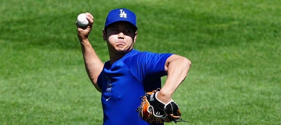 試合前にキャッチボールを行ったドジャース・大谷翔平【写真:荒川祐史】