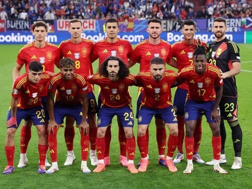 スペインの初期配置は基本的に4-3-3です。ボール保持をしてゆっくり攻めながら、両ウイングのニコ・ウィリアムズと、ラミン・ヤマルの質的優位を生かしたり、中盤のロドリ、ファビアン・ルイス、ペドリの関係性で攻めていきます。