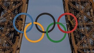 パリのエッフェル塔に設置された五輪マーク photo by AP/AFLO検証:オリンピックの存在意義01:プロローグ【…