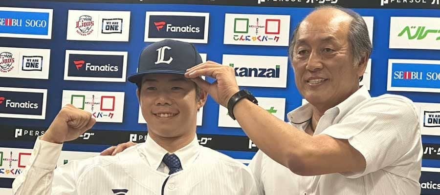 入団会見を行った西武・松原聖弥(左)と渡辺久信GM兼監督代行【写真:宮脇広久】