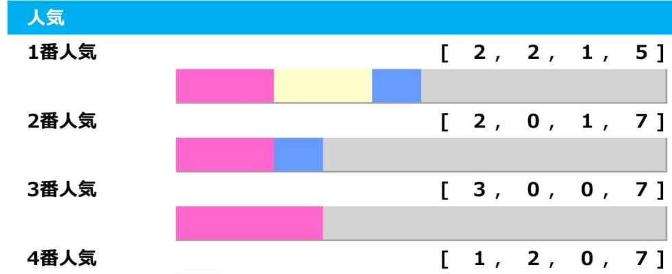 昨年こそ3人気→4人気→1人気の決着だったが、6番人気以下の成績は【1.6.6.83】で例年好走。好走馬の斤量は53~54キロ、現在に合わせると54~55キロだ。重すぎても軽すぎてもだめで、ジュンゴールドやヤマニンアドホック、ログラールはちょうどいい斤量で出走できる。