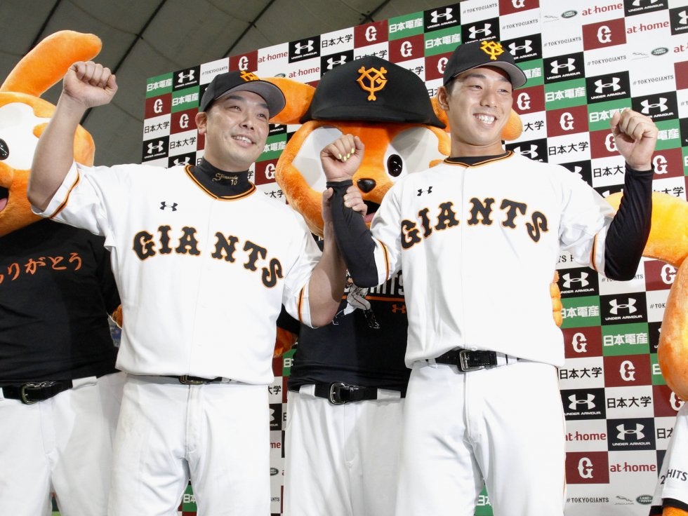 阪神に勝利し、笑顔でポーズをとる巨人・阿部(左)と宇佐見=東京ドーム【写真提供:共同通信社】
