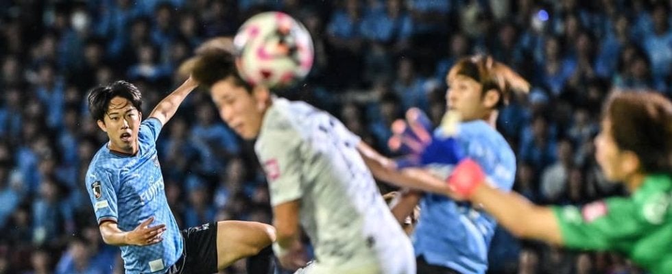 前半に放った川崎フロンターレDF佐々木旭のシュート場面 撮影:中地拓也