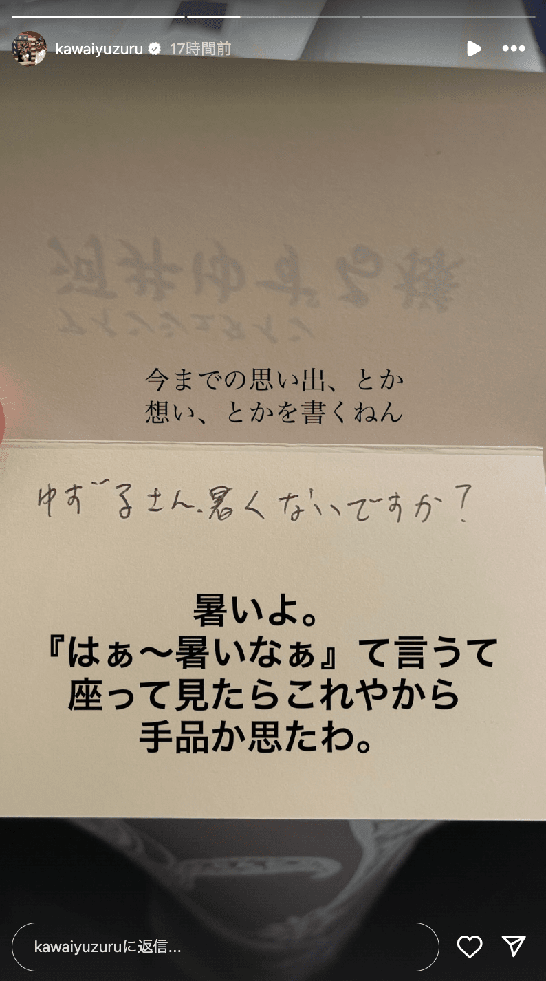 お笑い芸人のアインシュタイン・河合ゆずるが30日、自身のインスタグラムのストーリーを更新。新郎せいやから宛てられた「ゆず…