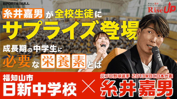 元プロ野球選手 糸井嘉男が地元・京都府の日新中学校をサプライズ訪問。成長期の中学生にとって重要な栄養素・食事を栄養のスペシャリストである管理栄養士と、アスリートの視点から糸井嘉男が伝える。
