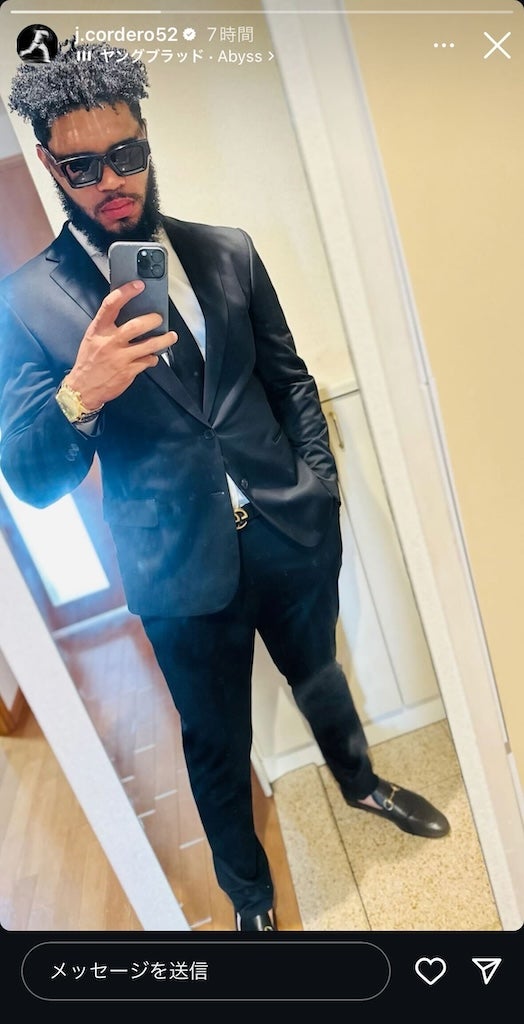 ストーリーズに1枚の写真を投稿、写真には金の時計にサングラスを身につけたスーツ姿のコルデロが映し出されている。