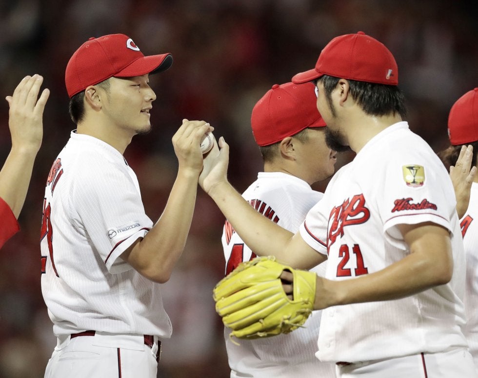 12勝目を挙げ、3番手中崎(右)からウイニングボールを受け取る広島・薮田=マツダ【写真提供:共同通信社】 広島東洋が中日…